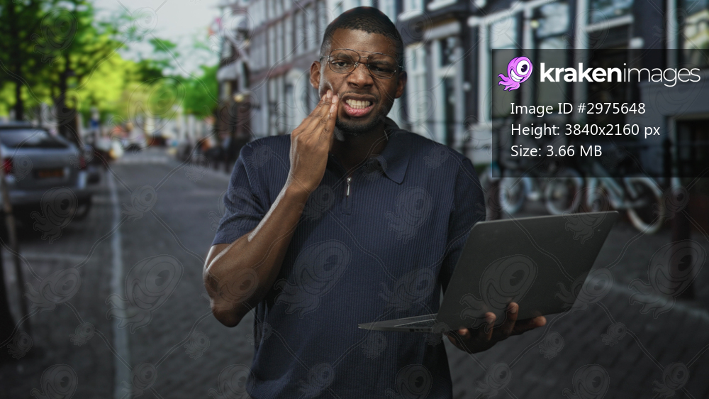 Man holding laptop touching cheek on a cobbled street with parked bicycles and cars; toothache frustration.
