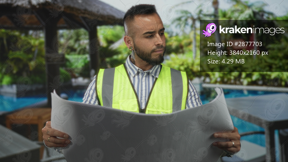 Man holding large blueprint with both hands wearing high visibility vest and striped shirt beside hotel pool and thatched cabana building; concentration. - Kraken Images