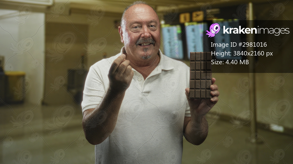 Man holding large chocolate bar in right hand, making pinched finger gesture at airport departure board; playful craving.