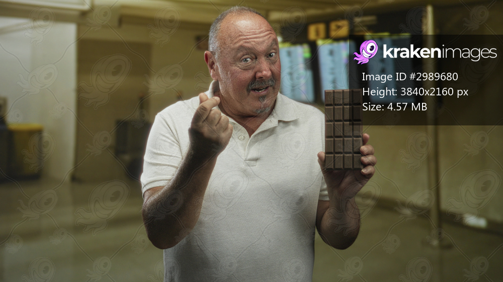 Man holding large chocolate bar in right hand, making pinched finger gesture at airport departure board; playful craving.