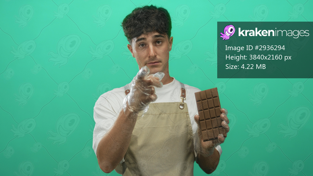 Man holding large chocolate bar and pointing finger while wearing clear gloves and beige apron in mint green studio; inviting snack.