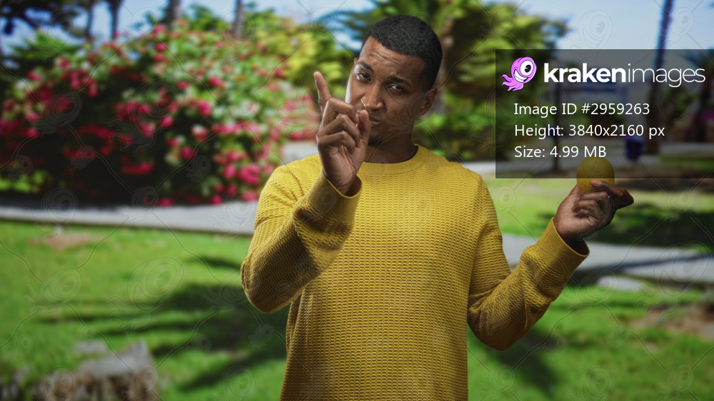 Man holding lemon in hand on street near park walkway, wearing yellow sweater and looking thoughtful while rotating the fruit; contemplation curiosity quiet. - Kraken Images