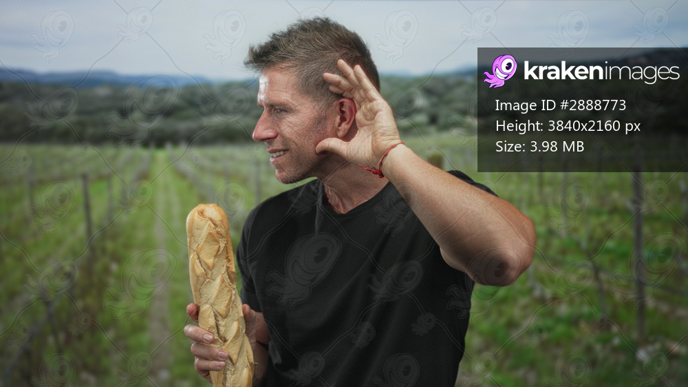 Man holding long baguette in a green vineyard field, right hand gripping the loaf near chest; serenity harvest simplicity.