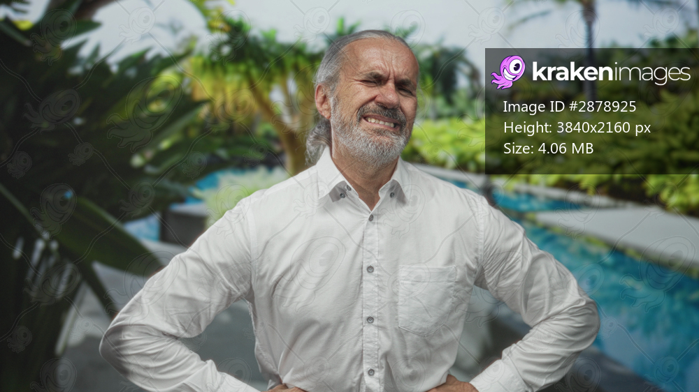 Man holding lower back for backache at pool resort outdoors, hands on hips in white shirt, grimacing; discomfort aging.