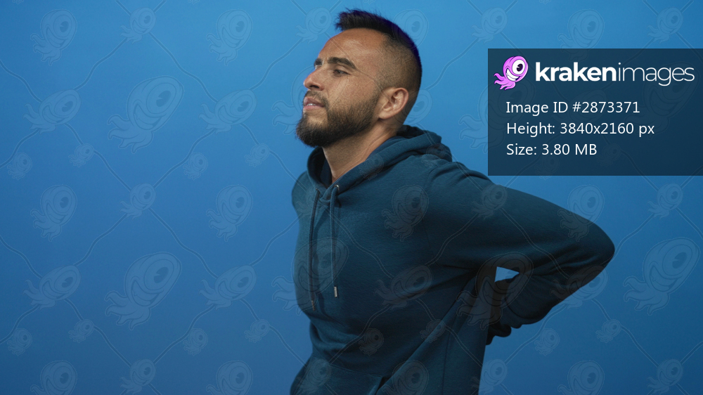 Man holding lower back while wincing and clasping waist, wearing hoodie in blue studio for backache; discomfort recovery resilience.
