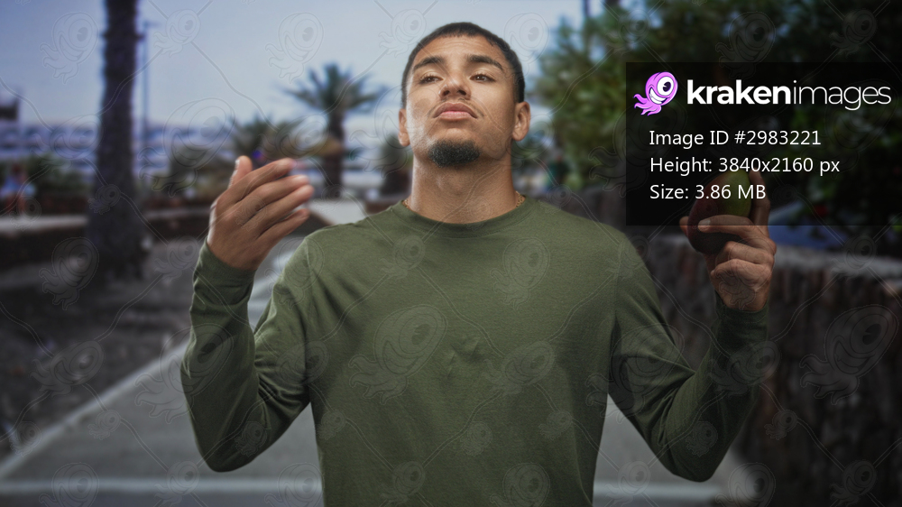 Man holding mango in right hand, looking upward with slight squint, standing on a street promenade framed by palm trees and low stone wall; contemplation. - Kraken Images