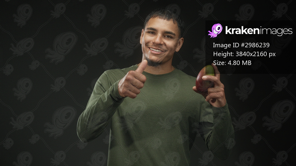 Man holding mango, points finger to mango and gives thumbs up in studio while smiling with green shirt; healthy snack cheerful.