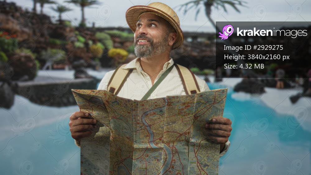 Man holding map and looking up at pool with hands visible, wearing straw pith hat and backpack while standing near water and rocks; wanderlust exploration. - Kraken Images