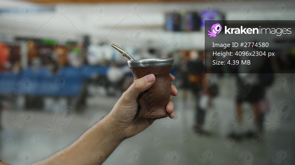 Man holding mate cup in hand at busy airport terminal with blurred background of travelers and seating, illustrating a casual travel ambiance.