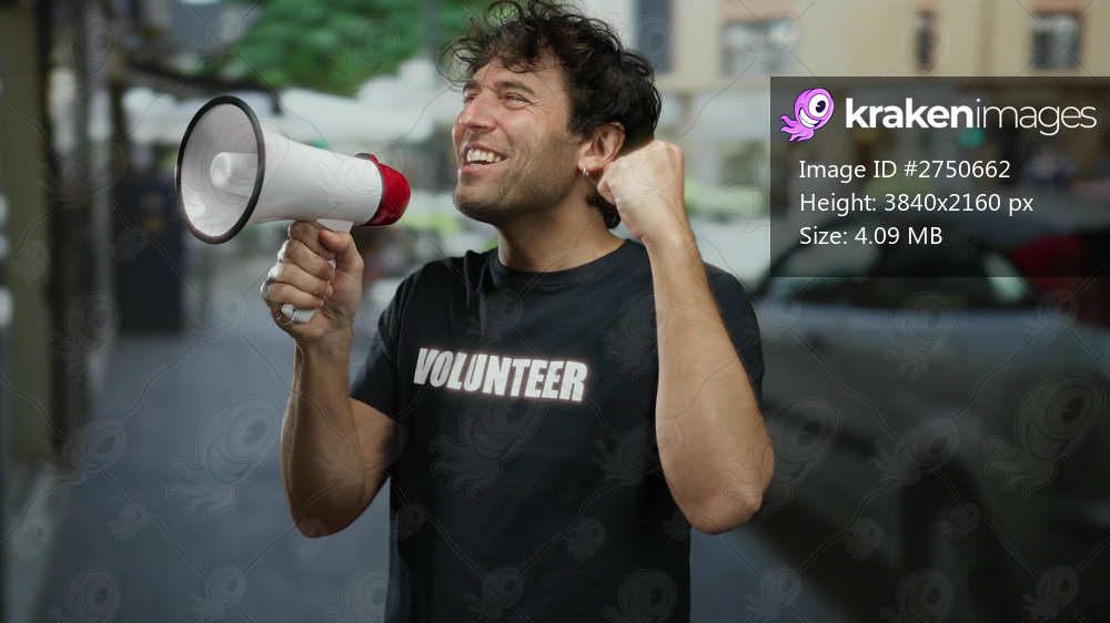 Man holding megaphone smiling in city street wearing volunteer shirt outdoors showing enthusiasm and confidence.