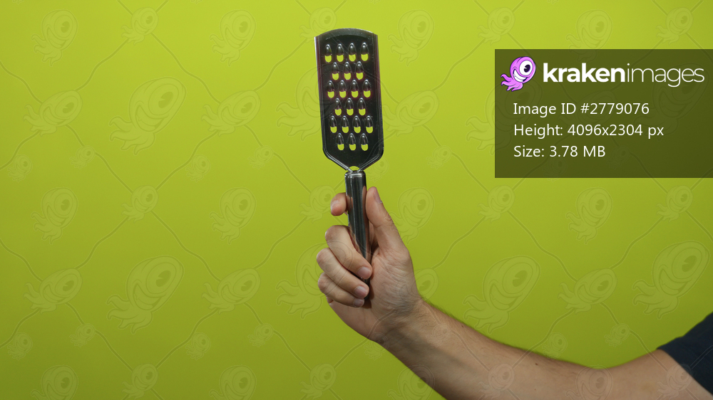 Man holding metal grater against yellow wall background suggesting kitchen preparation and culinary context with focus on hand and isolated utensil.