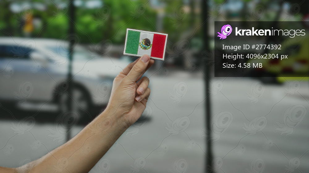 Man holding mexican flag embroidery patch on city street with cars passing by, capturing a vibrant outdoor urban scene.