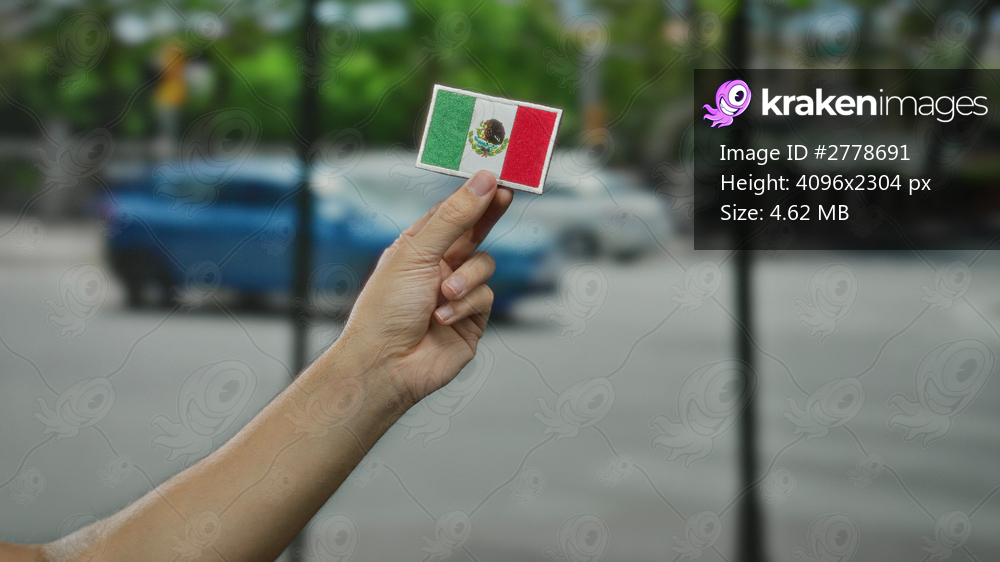 Man holding mexican flag embroidery patch on city street with cars passing by, capturing a vibrant outdoor urban scene.