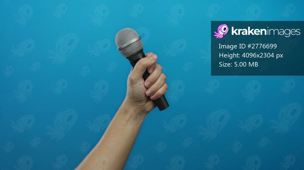 Man holding microphone against blue wall captures readiness for speech and public speaking.
