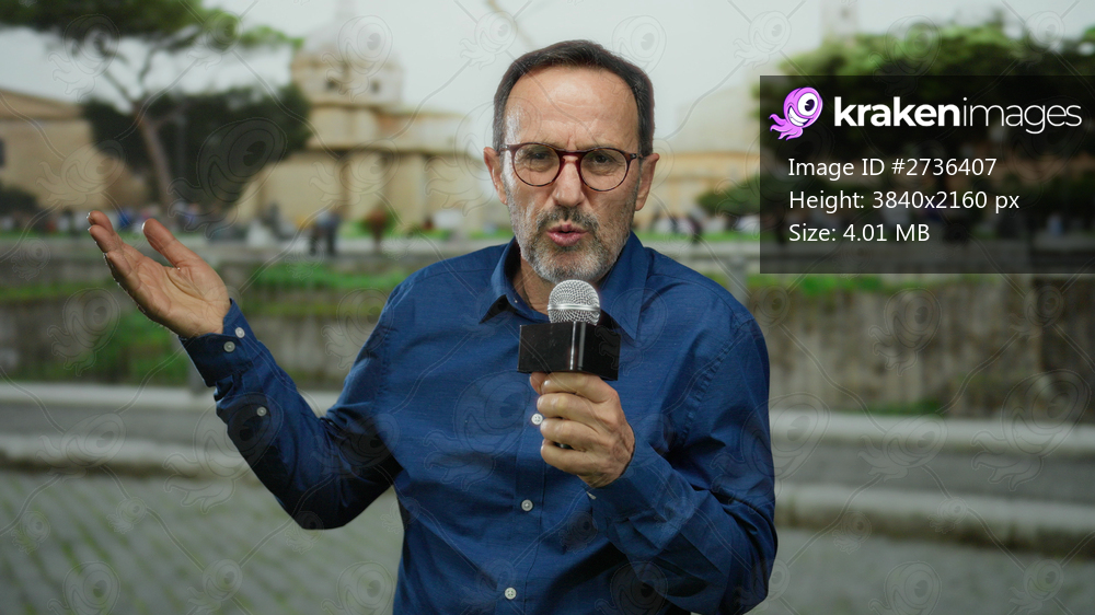 Man holding microphone in urban outdoor setting with trees and historical architecture, expressing emotion in sunny city park environment.