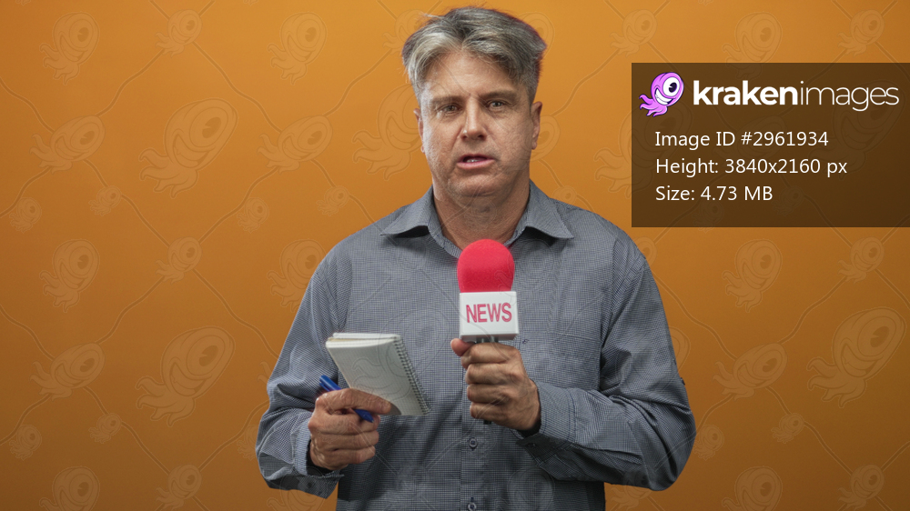 Man holding microphone and notepad, hand near mouth while reading notes in studio; serious reporting.