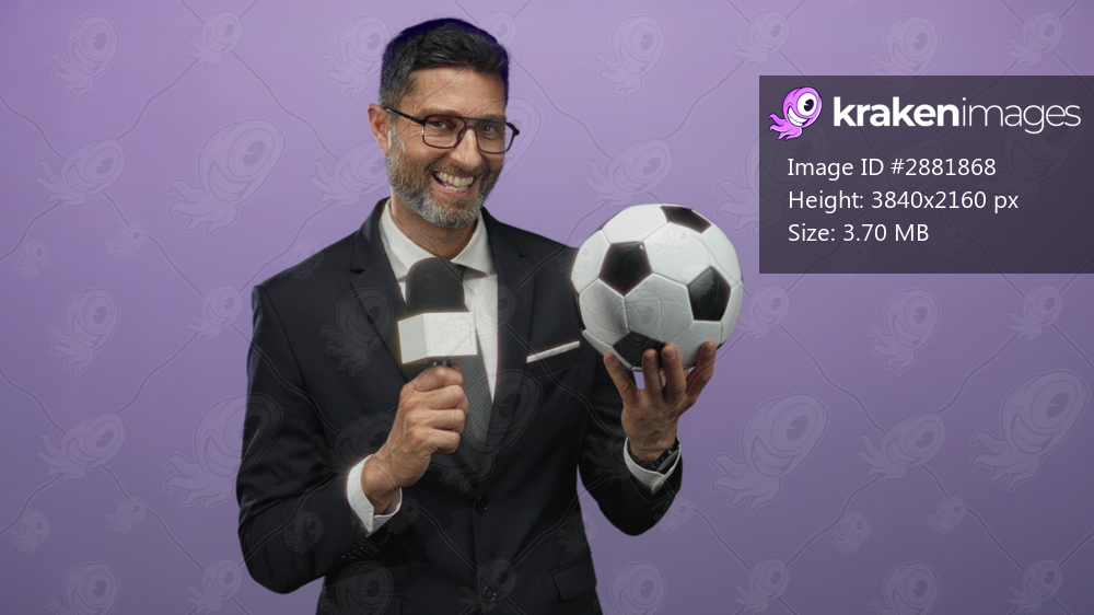 Man holding microphone and soccer ball in studio with purple backdrop; enthusiastic sports promotion.