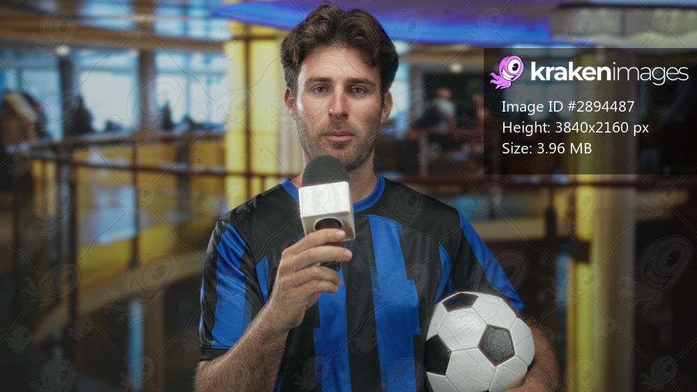 Man holding microphone and soccer ball while speaking into it, wearing blue striped jersey in hotel lobby by a glass railing and curved balcony with blurred crowd behind him; pride. - Kraken Images