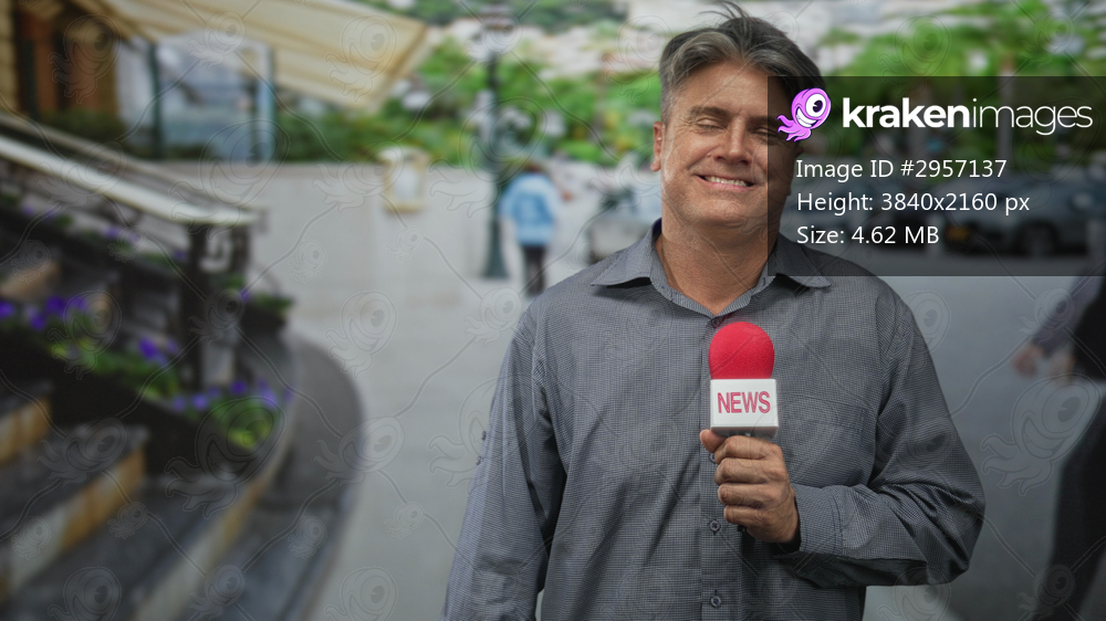 Man holding microphone with visible hand on street outside building by stairs and cars while smiling; calm confidence.