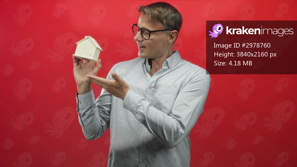 Man holding miniature house with left hand and presenting it with right hand in studio; confidence trust homeownership.
