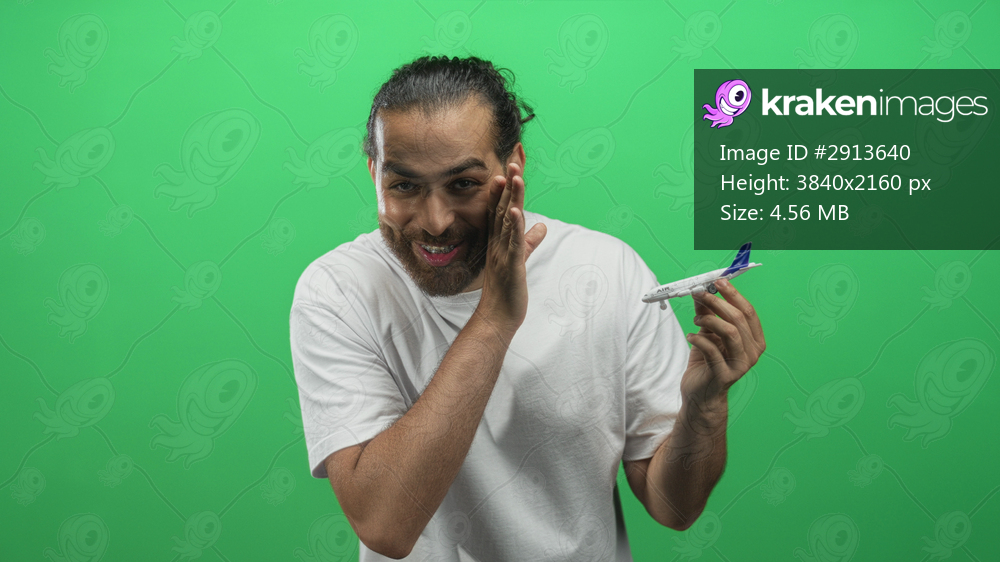 Man holding model airplane in right hand and touching cheek with left hand in green studio posing with toy plane; playful travel.