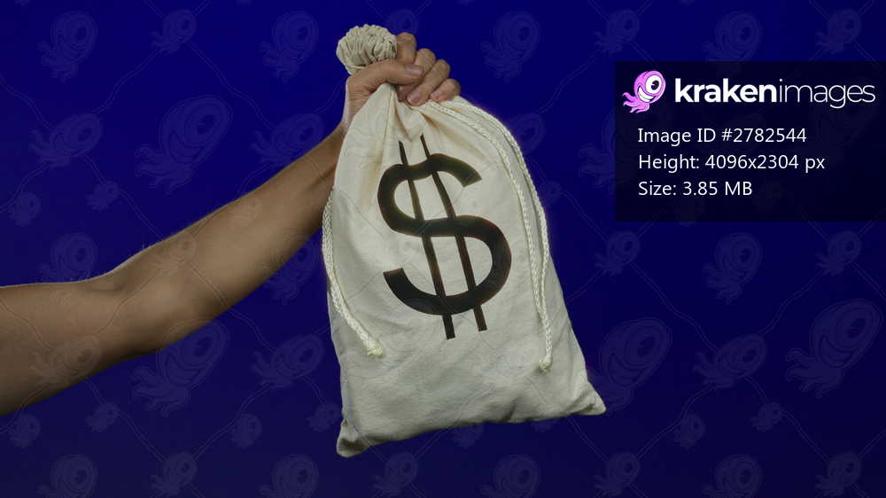 Man holding money bag with dollar symbol against blue background symbolizing wealth and finance concept with focus on male hand and isolated setting.
