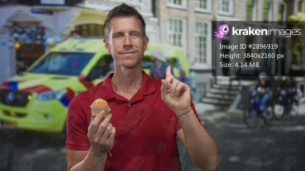 Man holding muffin and pointing index finger on city street with ambulance and cyclists nearby; curiosity decision.