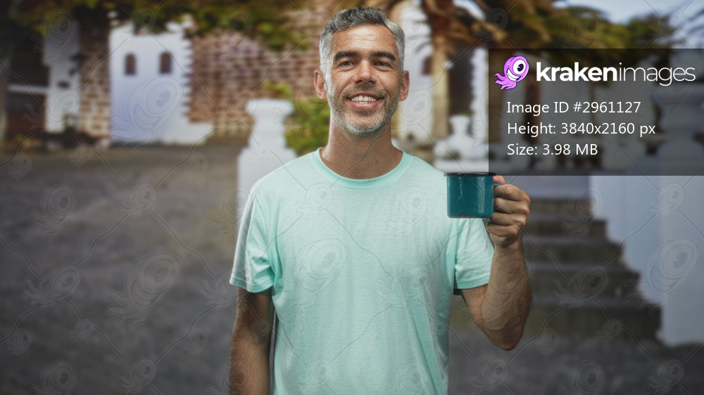 Man holding mug and smiling on building steps while raising cup in hand, casual mint shirt visible; calm morning.