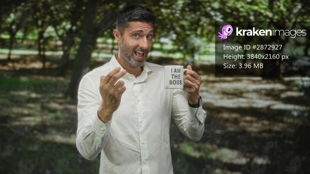 Man holding mug that reads i am the boss in green park pointing two fingers at camera; confidence playful humor.