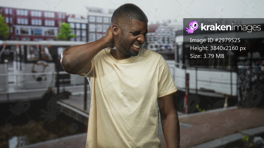 Man holding neck for backache and grimacing on street by a canal boat and dock, with nearby buildings and pavement visible; discomfort.