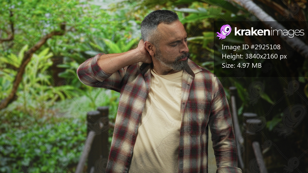 Man holding neck and grimacing on forest walkway, middle aged hispanic with grey hair and beard, plaid shirt and bare forearm visible; pain strain tiredness. - Kraken Images