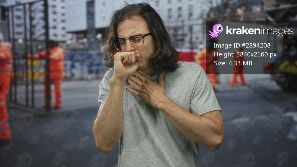 Man holding neck with hand in front of building at construction site, long hair and glasses visible; distress choking.