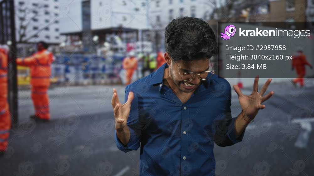 Man holding neck with one hand and raising both hands in an agitated gesture among orange road workers on a street; urban frustration.