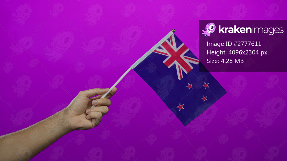 Man holding new zealand flag against pink background, showcasing national pride and identity with a clear isolated view of the flag and hand.