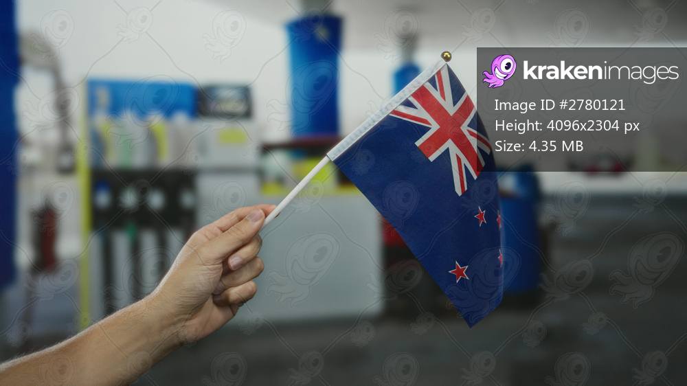 Man holding new zealand flag at outdoor petrol station with blurred background depicting fuel pumps and vibrant colors.