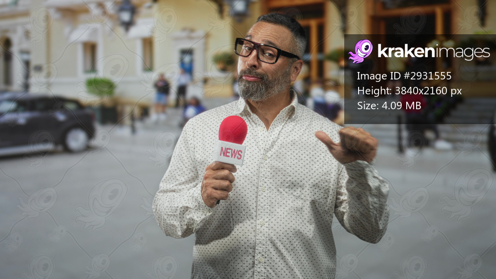Man holding news microphone and pointing thumb to chest on street with city steps and car in frame; wry confidence.