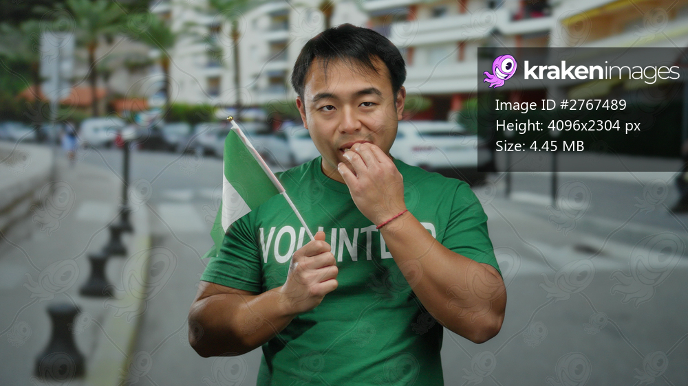 Man holding nigerian flag standing on urban street wearing green volunteer shirt with blurred cityscape in background indicating a multicultural outdoor environment. - Kraken Images
