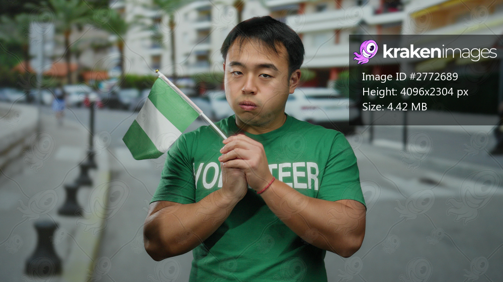 Man holding nigerian flag standing on urban street wearing green volunteer shirt with blurred cityscape in background indicating a multicultural outdoor environment. - Kraken Images