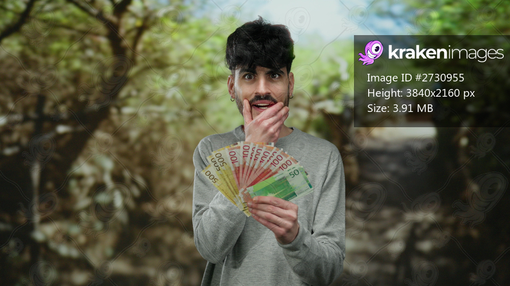 Man holding norwegian banknotes in a park, expressing surprise with greenery and sunlight in the background, wearing casual clothes and showcasing various currency denominations. - Kraken Images