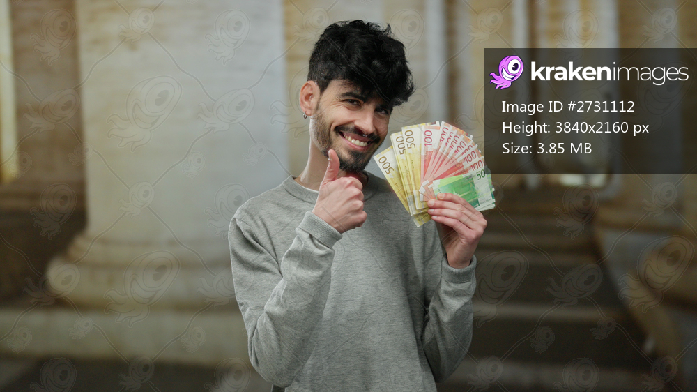 Man holding norwegian krone banknotes outdoors at an old university, showcasing money in an academic setting with a confident expression.