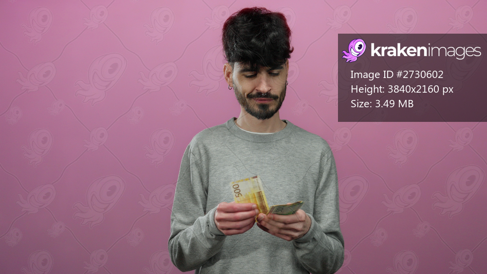 Man holding norwegian krone banknotes smiling against isolated pink background expressing financial happiness and prosperity with a casual look.
