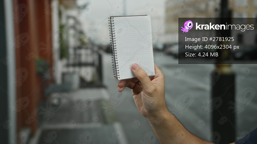 Man holding notebook on city street showcasing blank pages in urban outdoor setting, perfect for concepts related to ideas, creativity, notes, and planning. - Kraken Images