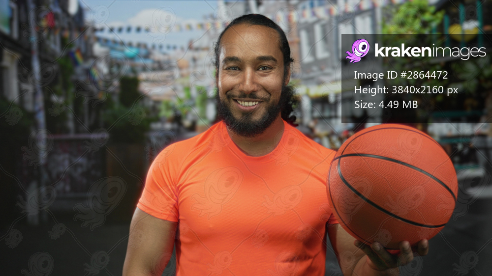 Man holding orange basketball with both hands on urban street, smiling and looking at the ball while wearing bright orange shirt; joy play community sport. - Kraken Images