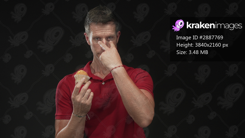 Man holding orange muffin and pointing finger to lips in black studio set while wearing red polo; playful curiosity.