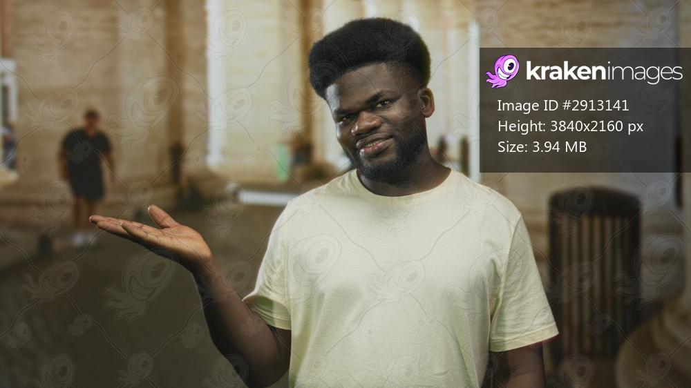 Man holding out his hand palm up on an old town street by stone columns and an arch near a building entrance; playful curiosity.