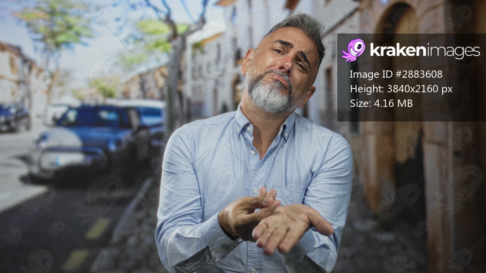 Man holding out open hands in a pleading gesture on a sunlit street with parked cars and stone buildings, looking sorrowful and imploring; desperation need. - Kraken Images