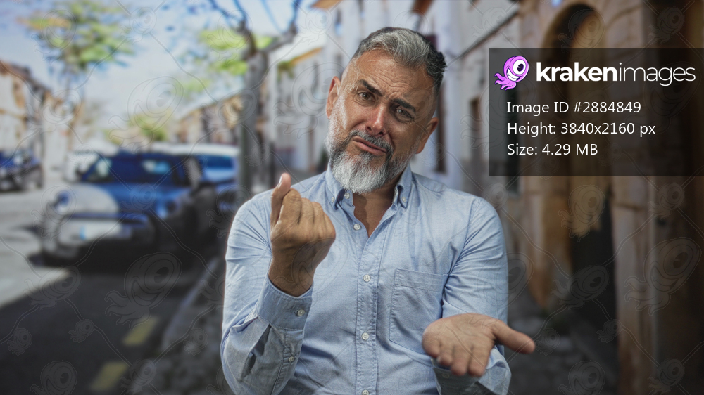 Man holding out open hands in a pleading gesture on a sunlit street with parked cars and stone buildings, looking sorrowful and imploring; desperation need. - Kraken Images
