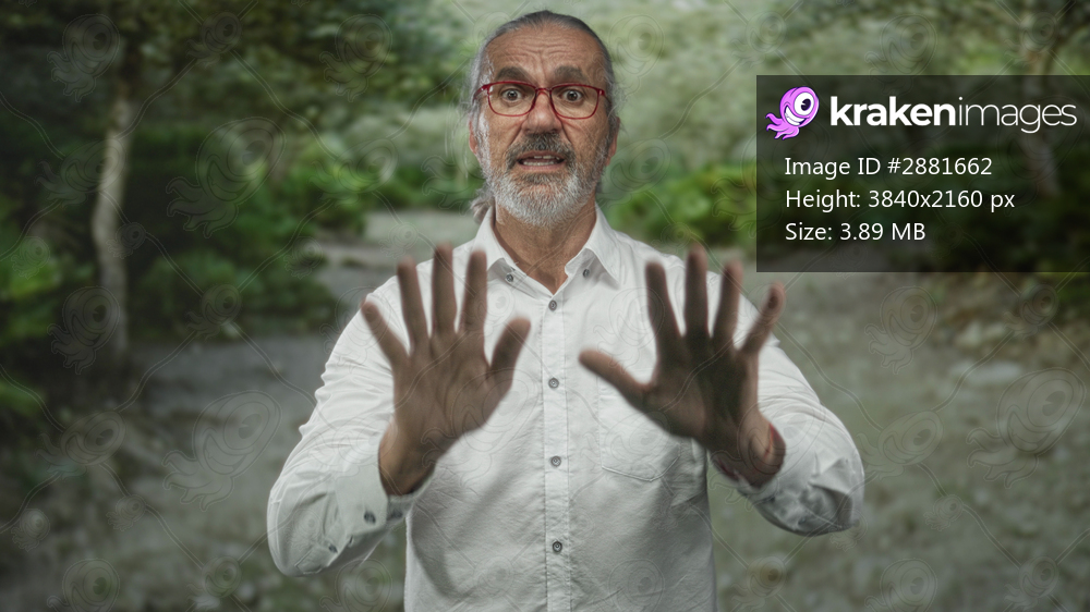 Man holding palms forward in a forest path, palms facing camera, wearing white shirt and red glasses; concern caution.