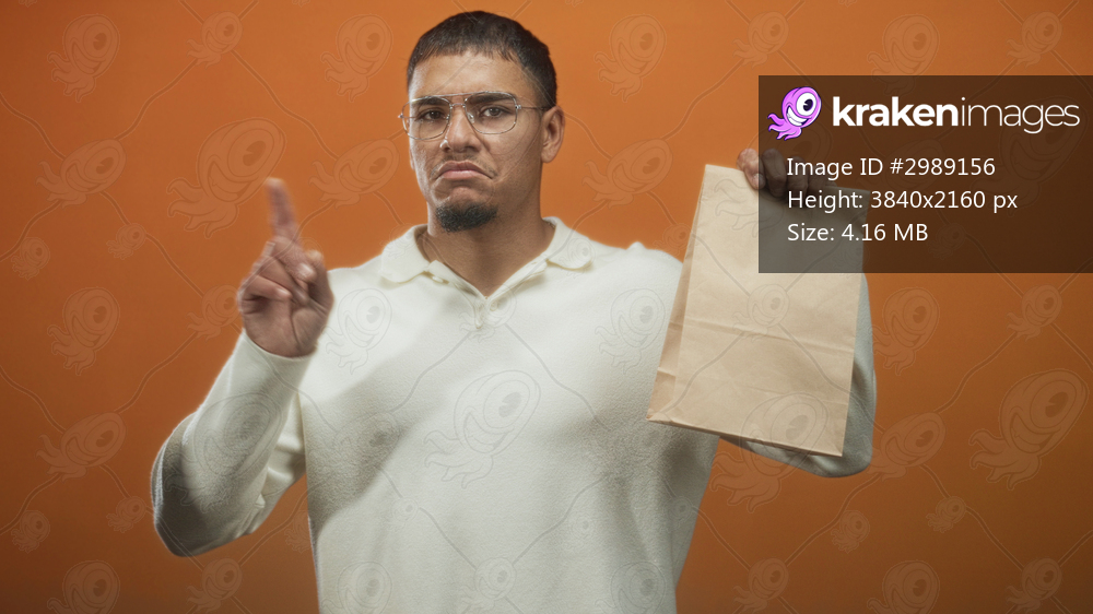 Man holding paper bag and pointing finger in a studio with orange backdrop and white polo; disapproval refusal.