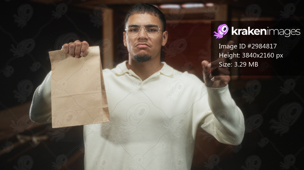 Man holding paper bag and points finger up in studio interior, wearing glasses and white pullover, neutral displeased expression; warning disapproval.